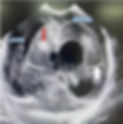En esta sección coronal obtenida con ecografía cerebral observamos el cerebro de un recién nacido a término. La superficie del cerebro es lisa, no se observan las circunvoluciones correspondientes a la edad gestacional del bebé, únicamente podemos observar la cisura de Silvio (flecha blanca) Adicionalmente tiene ventriculomegalia, e higromas subdurales bilaterales (flechas celestes). Sospechamos que este trastorno de migración es resultado de una agresión durante la maduración cerebral porque adicionalmente podemos observar lesiones isquémicas (flecha roja).